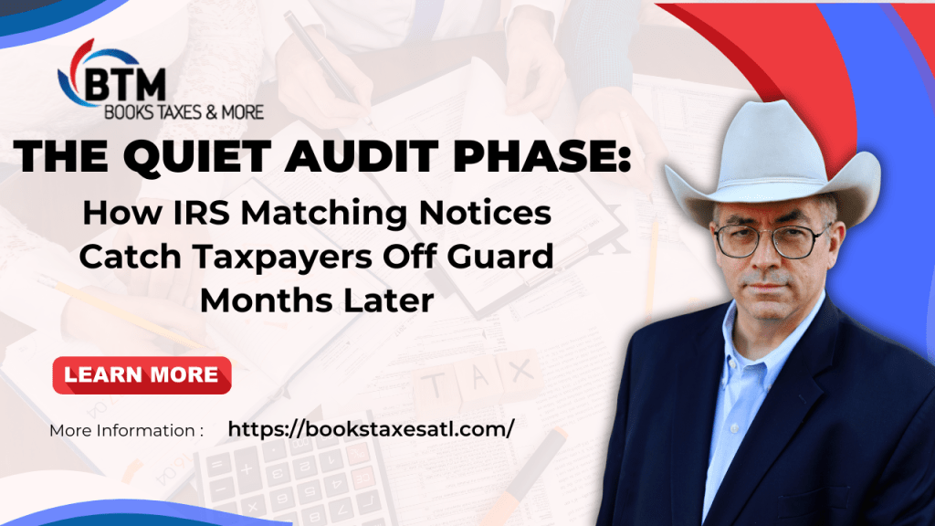 If you are unsure what happens next after filing or whether your return could trigger IRS correspondence, speak with Steve Perry, EA to review your position. Call 678-717-9818, email steve@bookstaxesatl.com, or connect on LinkedIn at www.linkedin.com/in/steveperrybtm.